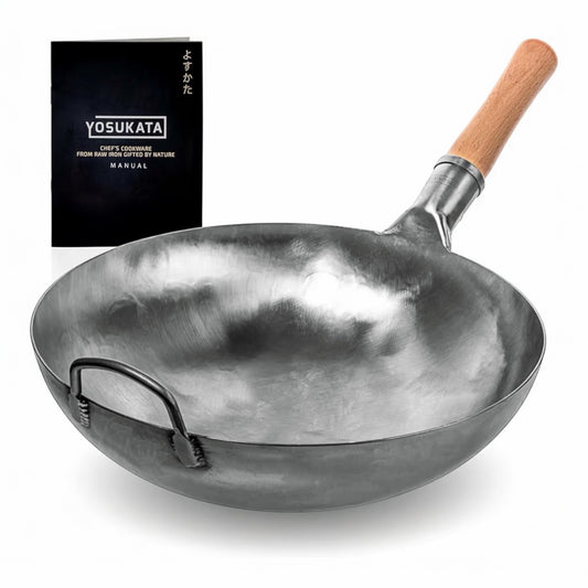 YOSUKATA 36 cm Round Bottom Carbon Steel Wok Pan – Blue Pre-Seasoned Pow Wok for Stir Fry, BBQ, Grill & Camping – Traditional Japanese & Chinese Cookware – Compatible with Gas Stoves & Open Fire Only